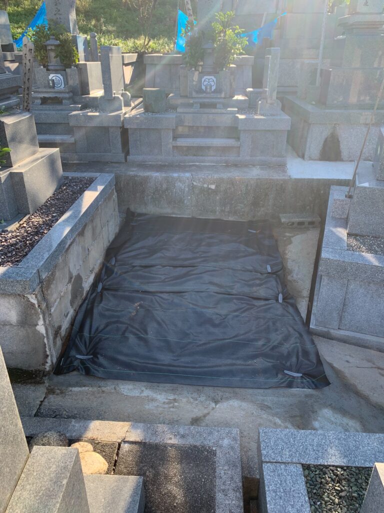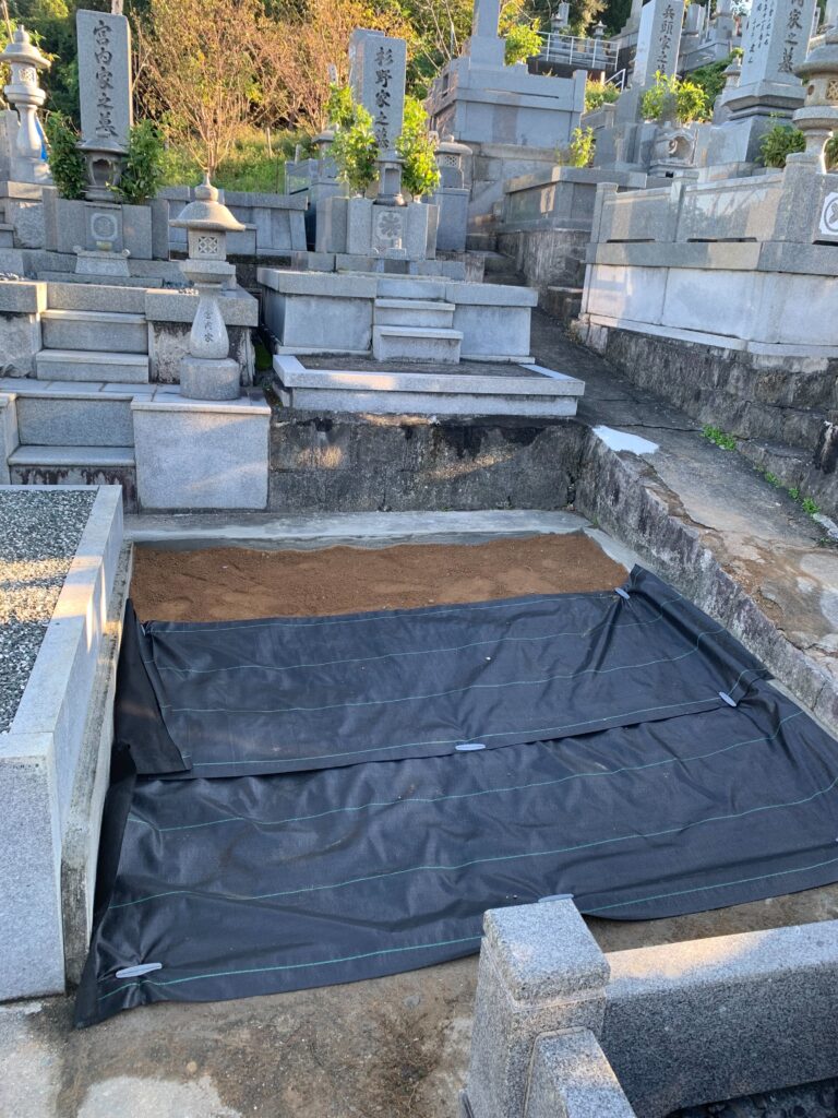 代々墓の撤去後、墓地管理者からの依頼で真砂土仕上げの後、防草シートを貼ってます。